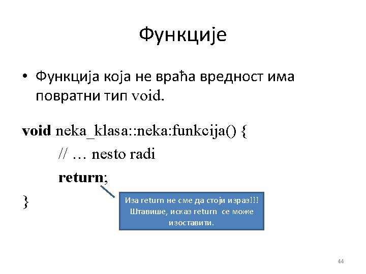 Функције class brojac { int broj; public: brojac(); // konstruktor ne vraca cak ni void int povecaj(int koliko_puta, int za_koliko); }; brojac: : brojac() {broj=0; } int brojac: : povecaj(int puta, int koliko) { return broj+=puta*koliko; } 43