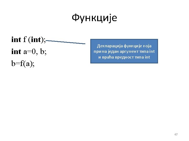 Функције int zbir (brojac a, brojac b) { return a. povecaj(1, 1)+b. povecaj(1, 1); } 46