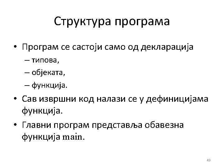 Функције int f(int); // f je tipa "funkcija koja prima jedan //argument tipa int i vracа int"; int (*p)(int); // p je tipa "pokazivac na funkciju // koja prima jedan argument tipa int // i vraca int"; p=&f; // p ukazuje na f; int a; a=(*p)(1); // poziva se funkcija na koju ukazuje p, // a to je funkcija f; 48