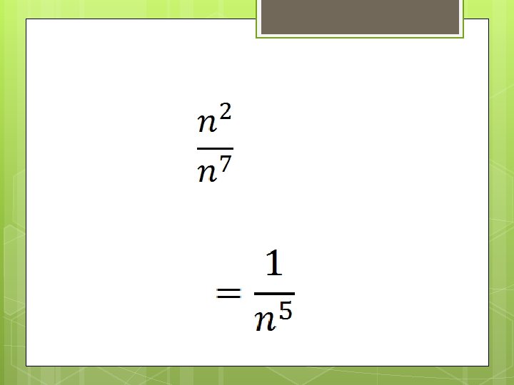 Quotient Power Property Saying goes: When dividing an expression with a power, SUBTRACT the powers. They must have the same base in order to subtract. What are the base(s) and the power(s)?