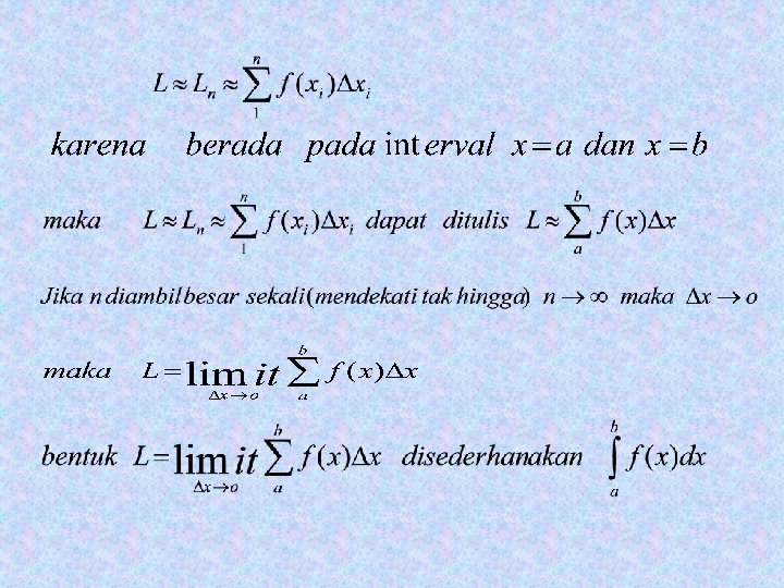 Y=f(x) Y Li L 1 L 2 Ln L 3 X=a X=b o diambil luasan ke-I ( Li ) X