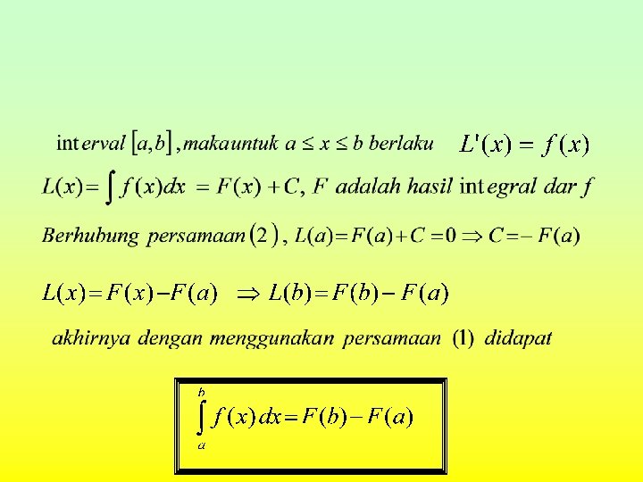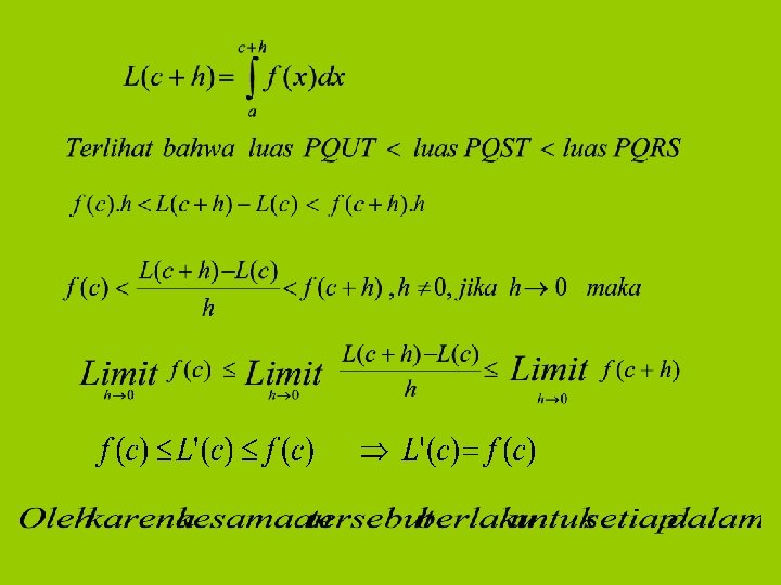 Menghitung integral tertentu Integral tertentu adalah integral yang ada batas bawah dan batas a disebut batas bawah b disebut batas Y=f(x) Misal luas yg dibatasi y=f(x) dg sb x dari x=a sd x=b adalah L(b) y S T R U f(c+h) f(c) o X=a P h Q c C+h X=b x