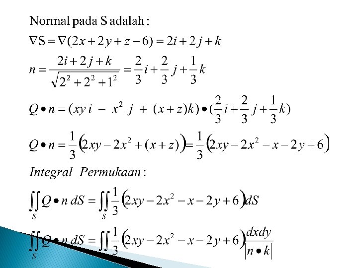 � Sehingga integral permukaan (fluks) akibat sebuah skalar fungsi (medan vektor Q) pada sebuah permukaan S adalah :