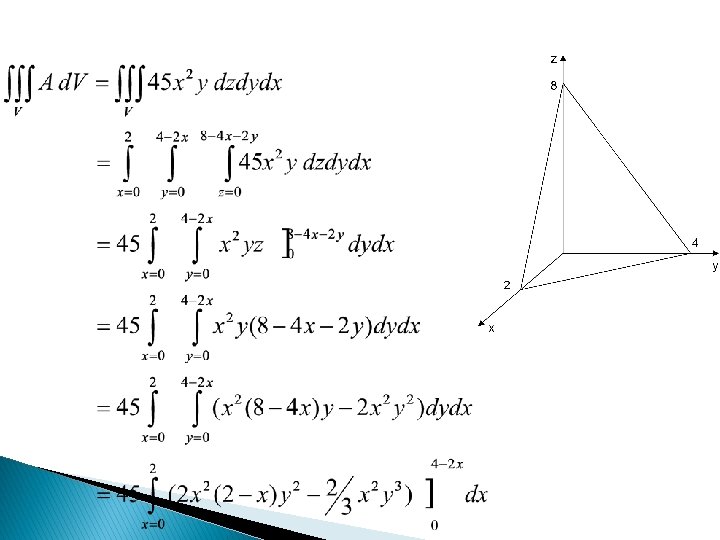 Contoh � Diberikan A = 45 x 2 y dan V merupakan volume ruang tertutup yang dibatasi oleh bidang 4 x + 2 y + z = 8, x=0 y=0 z=0 hitunglah integral volumenya