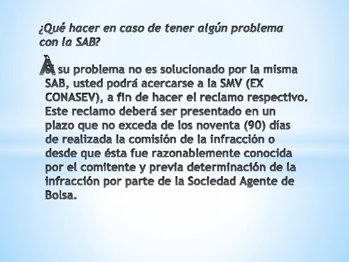 * Para invertir en la bolsa de valores se debe tomar contacto con una SOCIEDAD AGENTE DE BOLSA (SAB) ya que estas son intermediarias autorizadas para operar dentro de la Bolsa, ya sea por cuenta propia o por cuenta de terceros, además se encuentran facultadas para orientar a sus clientes en las diversas inversiones que realicen.