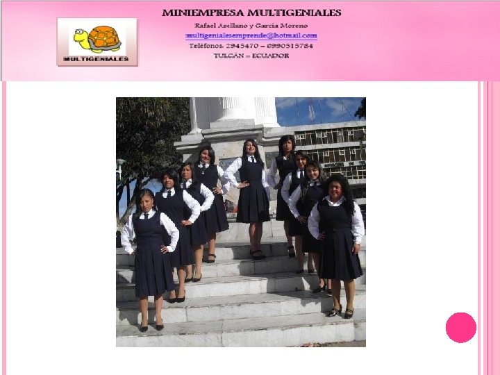 Presentación Hola: Somos la mini empresa Multigeniales formada por ocho estudiantes de tercer año de bachillerato en ciencias, con énfasis en sociales paralelo tres de la Unidad Educativa Tulcán de la ciudad de Tulcán, en la Provincia del Carchi, Ecuador, nos dedicamos a elaborar productos en dos ramas alimenticia y artesanía
