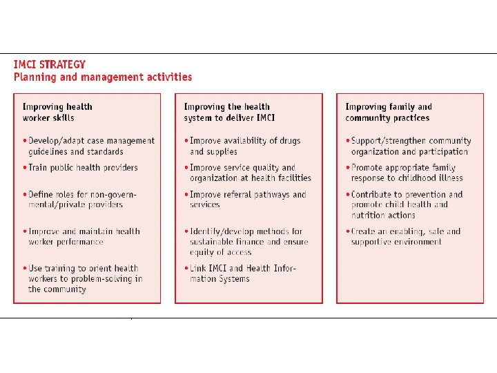 Components of Integrated approach • Improvement in case management skills of health staff through locally-adapted guidelines • Improvements in overall health system • Improvements in family and community health care practices
