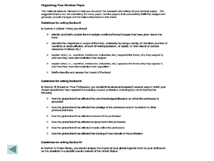 Capstone student project • The “seminar paper” – 12 -15 page academic research paper with 3 components: • Analysis of a major global trend • Examination of trend’s impact on student’s professional field • Case study: example of the global trend interacting with professional issues in a specific foreign country