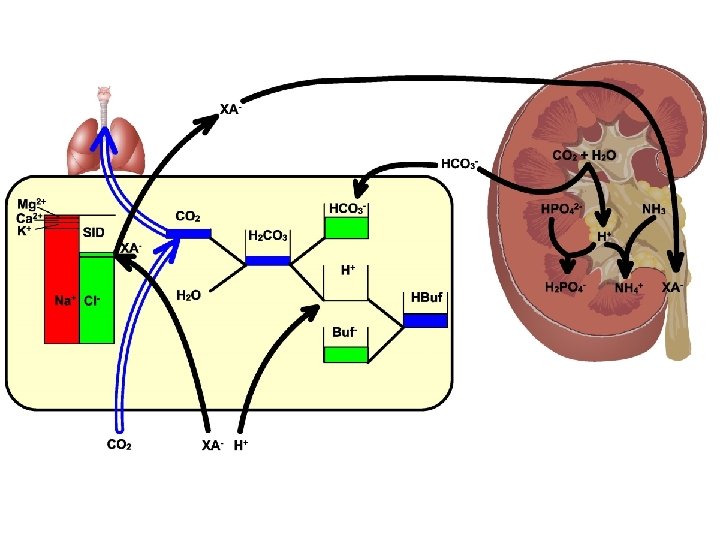 Stewart theory (1983) Ca+ K+ Mg+ Na+ HCO 3 - Buf- XA - Cl- SID [H+] [OH-] = K'w Peter Stewart [Buf-]+[HBuf] = [Buf. TOT] [Buf-] [H+] = KBuf [HBuf] [H+] [HCO 3 -] = M × p. CO 2 [H+] [CO 32 -] = N × [HCO 3 -] SID+ [H+]– [HCO 3 -] – [Buf-]– [CO 32 -]– [OH-] = 0