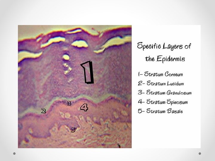 Layer of Epidermis (deep to superficial) 1. Stratum basale · Cells undergoing mitosis · Lies next to dermis 2. Stratum spinosum 3. Stratum granulosum 4. Stratum lucidum · Occurs only in thick skin 5. Stratum corneum · Shingle-like dead cells