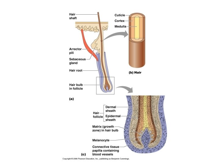 Hair • Fastest growing cells living in the matrix, dead cells in shaft. • Surface arrector pili muscleattaches the hair to dermis • Contracted = skin dimples
