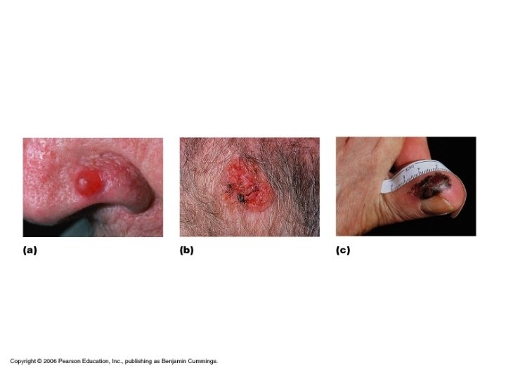 Malignant Melanoma • From melanocytes, can be deadly • A- asymmetry • B- border irregularity • C- color • D- diameter-> 6 mm (size of an eraser on a pencil)