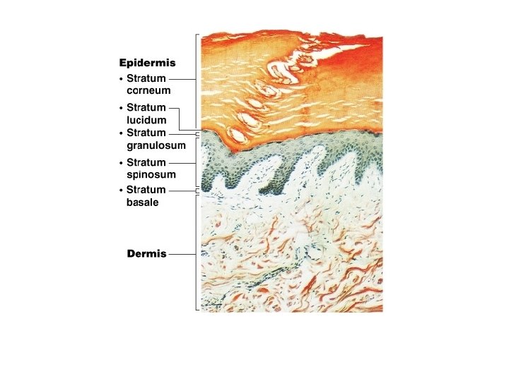 -Stratum (bottom) nd spinosum-2 -Stratum granulose-3 rd -Stratum lucidum-4 th -Stratum corneum-top 2030 layers of thick dead cells, filled with keratin