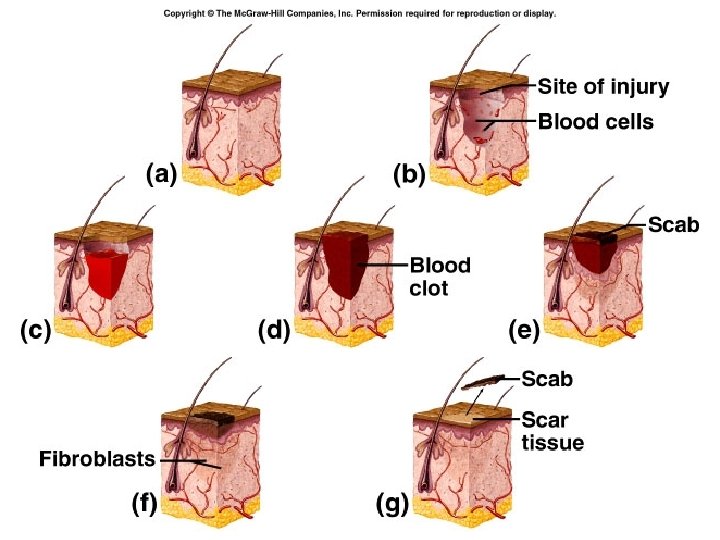 Skin repair • Inflammation- blood vessels dilate, allow fluids to leak into damaged tissue • Fluids have clotting proteins and other substances • Increase in WBC, debris removed, clot forms