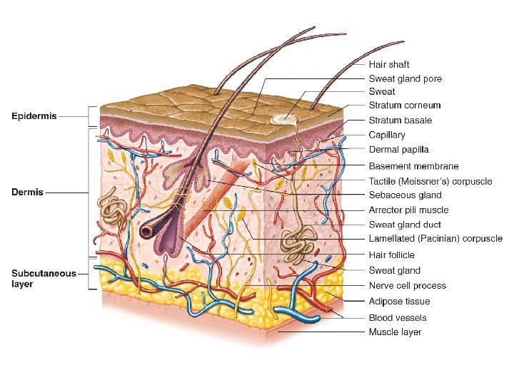 Dermis • • Binds epidermis to underlying tissues Dense connective tissue Muscle cells Nerve cells Blood vessels Hair follicles Glands Epidermis Dermis Subcutaneous layer Hair shaft Sweat gland pore Sweat Stratum corneum Stratum basale Dermal papilla Basement membrane Capillary Tactile (Meissner’s) corpuscle Sweat gland duct Sebaceous gland Arrector pili muscle Sweat gland Lamellated (Pacinian) corpuscle Hair follicle Adipose tissue Nerve cell process Blood vessels Muscle layer