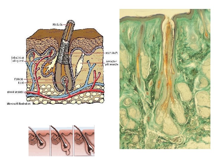 Hair is composed primarily of keratin and covers most of the body. The hair grows from the follicle, a sheath in the dermis. Most follicles have a small muscle associated with it, which allows it to raise forming “goose bumps. ” Factoid: eye lashes protect eyes, but also sense when something is coming towards the eye. Grow new eyelashes every 5 weeks.