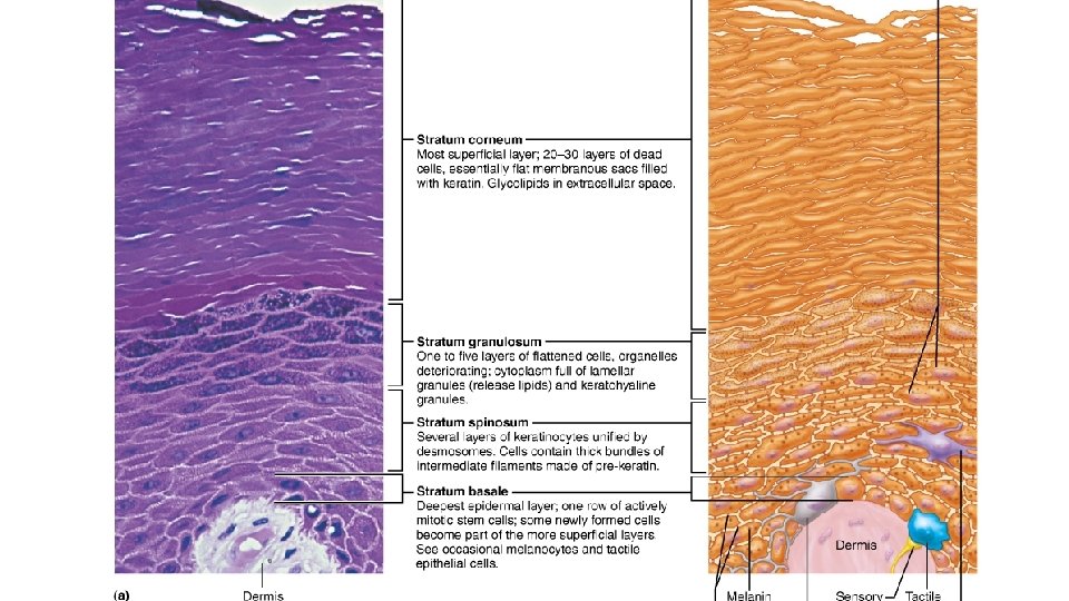 Layers of the Epidermis • Cells change by going through apoptosis (controlled cell death) – – Dead cells slough off as dandruff and dander Humans can shed ~50, 000 cells every minute