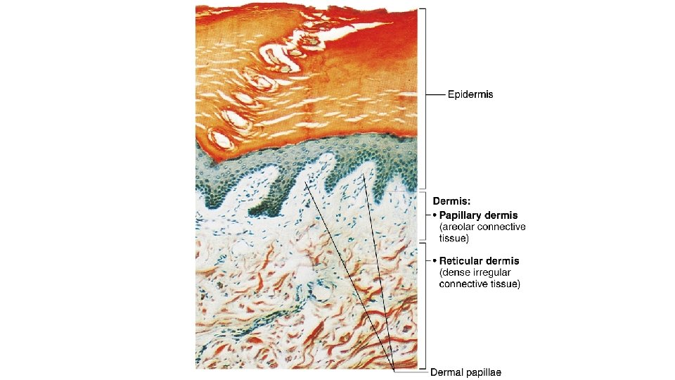 Papillary Layer • Dermal papillae: superficial region of dermis that sends fingerlike projections up into epidermis – Projections contains capillary loops, free nerve endings, and touch receptors (tactile corpuscles, also called Meissner’s corpuscles)