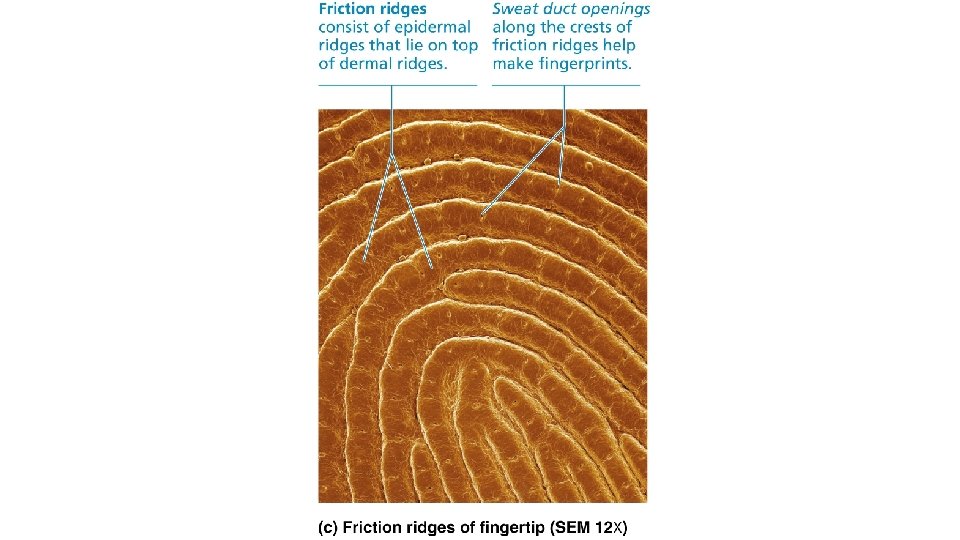 Papillary Layer • In thick skin, dermal papillae lie on top of dermal ridges, which give rise to epidermal ridges – Collectively ridges are called friction ridges • • • Enhance gripping ability Contribute to sense of touch Sweat pores in ridges leave unique fingerprint pattern