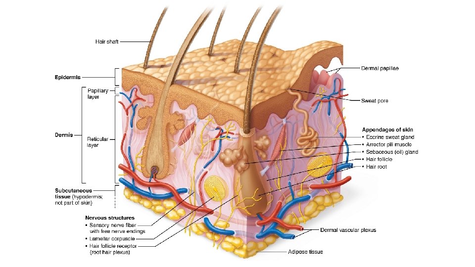 Structure of skin (sort of) – Hypodermis (superficial fascia) • • Subcutaneous layer deep to skin Not part of skin but shares some functions Mostly adipose tissue that absorbs shock and insulates Anchors skin to underlying structures: mostly muscles