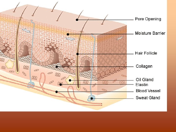 Function of Integumentary system • Functions: 1) physical barrier b/w the inside and outside of the body. 2)Contains nerve endings: sense, heat, pressure and pain. 3)maintain homeostasis by regulating temperature, retaining body fluids, and eliminating wastes
