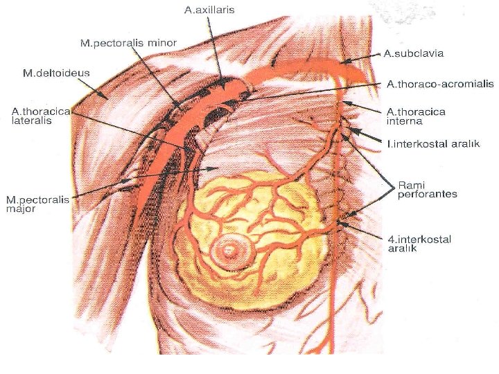 MEMENİN DAMARLARI Arterleri A. thoracica interna>>>>> Rami mammarii mediales A. thoracica lateralis >>>> Rami mammarii laterales Venleri V. axillaris V. toracica interna’da sonlanır.