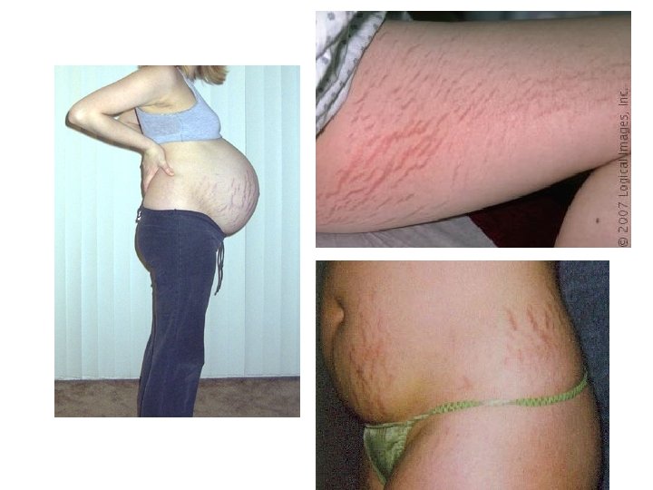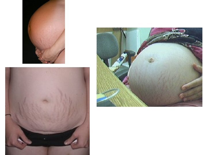 Striae gravidarum Gebelik esnasında bazı kadınlarda karın, meme ve kalçalar üzerinde beyaz ve parlak çizgiler oluşur. Buna Striae gravidarum denir. Derinin fazla gerilmesinden oluşan bu durum, corium’daki elastik lifler harap olduğu için, düzelmez.