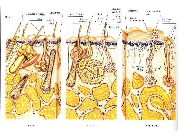 PİLİ (KILLAR) Vücudun çeşitli yerlerinde yoktur -Elin palmar yüzünde -Ayak tabanında -3. falanksların dorsal yüzünde -Preputium’da -Labia majora ve minora’nın iç yüzünde -Umbilicus’ta -Clitoris ve Glans penis