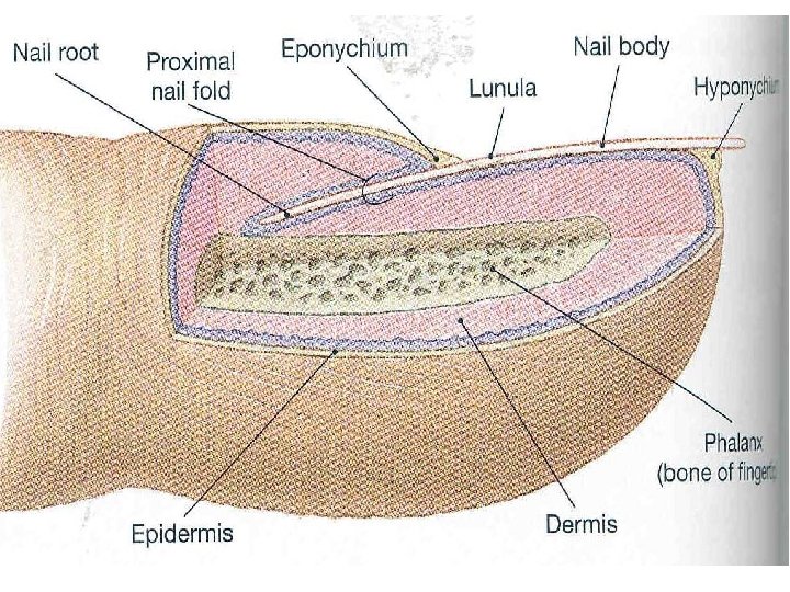 Tırnağın uzayarak kesilen kısmı derinin Stratum corneum tabakasına uyar. Margo liber Corpus unguis Vallum unguis Lunula Eponychium