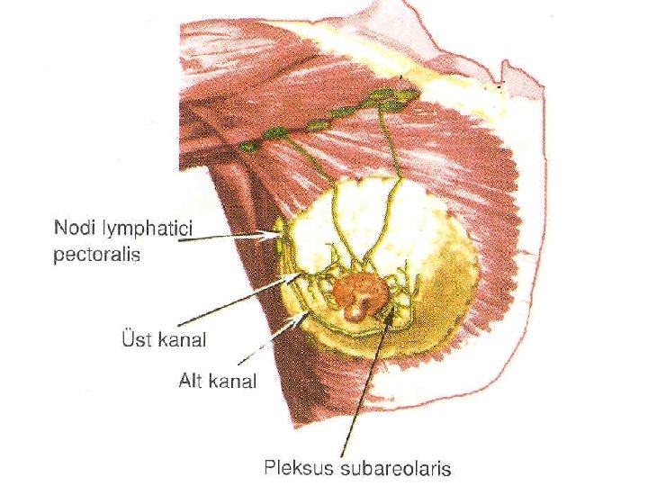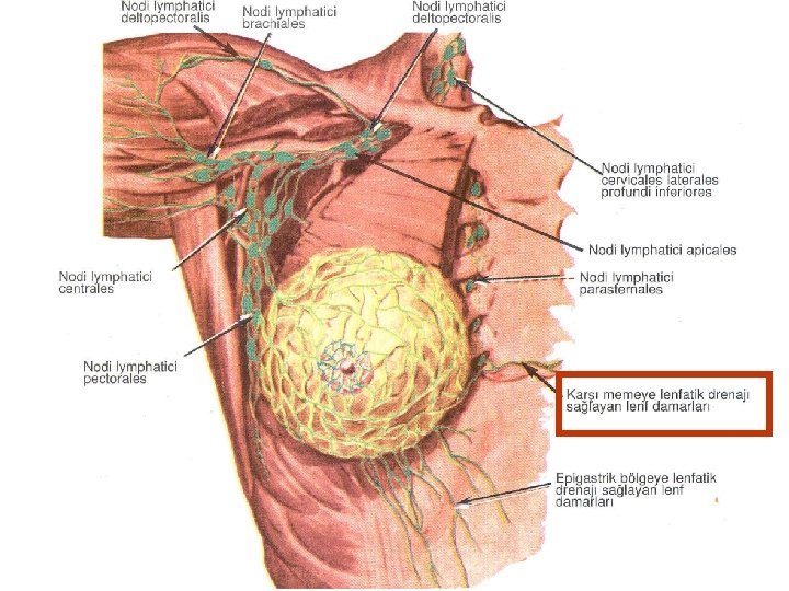 MEMENİN LENF DAMARLARI Ductus lactiferi çevresinde ve Septum interlobulare’de bulunan lenf ağından başlar. Bezin santral kısmından gelen lenf damarları Areola mammae’nin altında bulunan karışık bir lenf ağına geçerler. Burası ayrıca bezin santral kısmını örten deri, Areola mammae ve Papilla mammae’den de lenf damarları alır. Bunların efferent damarları birleşerek iki ana kök halinde Nodi lymph. pectorales’e (Koltuk altı) dökülürler.