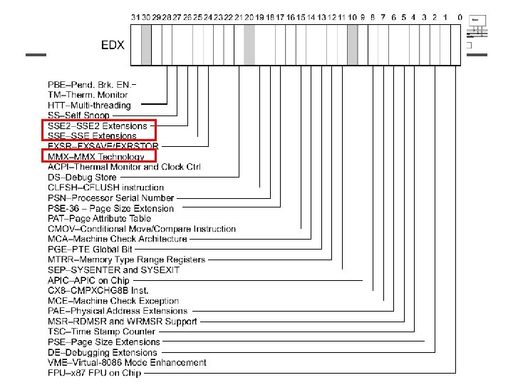 Detect MMX/SSE mov eax, 1 ; request version info cpuid ; supported since Pentium test edx, 00800000 h ; bit 23 ; 02000000 h (bit 25) SSE ; 04000000 h (bit 26) SSE 2 jnz Has. MMX 19