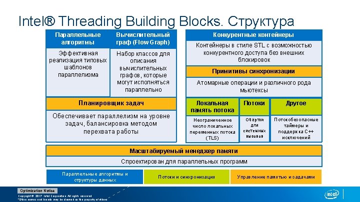 Intel® Threading Building Blocks. Элементы балансировки нагрузки Optimization Notice Copyright © 2017, Intel Corporation. All rights reserved. *Other names and brands may be claimed as the property of others.