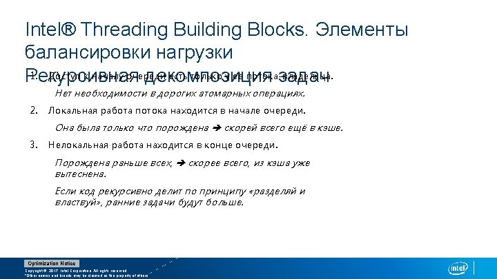 Intel® Threading Building Blocks. Элементы балансировки нагрузки Рекурсивная декомпозиция задач [Data, Data+N) [Data, Data+N/2) [Data, Data+N/k) [Data, Data+Grain. Size) Optimization Notice Copyright © 2017, Intel Corporation. All rights reserved. *Other names and brands may be claimed as the property of others. [Data+N/2, Data+N) Доступные для перехвата задачи