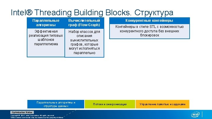 Intel® Threading Building Blocks. Шаблоны параллельных Алгоритмов Optimization Notice Copyright © 2017, Intel Corporation. All rights reserved. *Other names and brands may be claimed as the property of others.