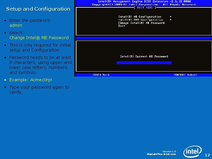 v 2. 5. 15. 0000 Setup and Configuration • System will Re-Boot. Press: <CTRL-P> to Enter Intel® ME Setup. Version 1. 0 digitaloffice. intel. com 11