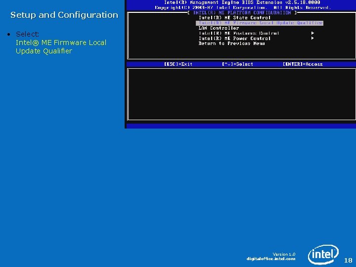 Setup and Configuration • Select: Intel® ME Firmware Local Update Qualifier Version 1. 0 digitaloffice. intel. com 18