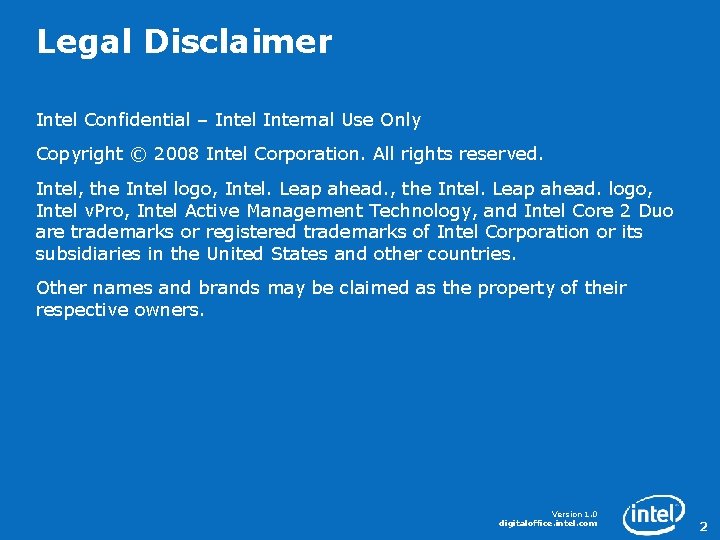 Legal Disclaimer Intel Confidential – Intel Internal Use Only Copyright © 2008 Intel Corporation. All rights reserved. Intel, the Intel logo, Intel. Leap ahead. , the Intel. Leap ahead. logo, Intel v. Pro, Intel Active Management Technology, and Intel Core 2 Duo are trademarks or registered trademarks of Intel Corporation or its subsidiaries in the United States and other countries. Other names and brands may be claimed as the property of their respective owners. Version 1. 0 digitaloffice. intel. com 2