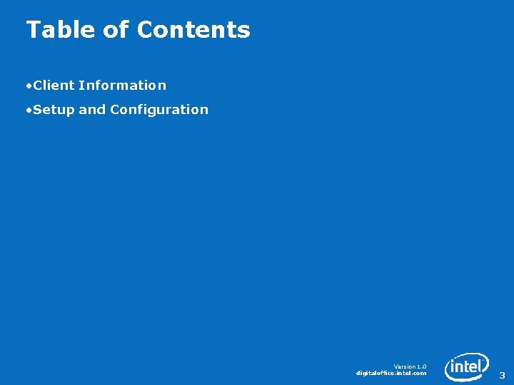 Table of Contents • Client Information • Setup and Configuration Version 1. 0 digitaloffice. intel. com 3