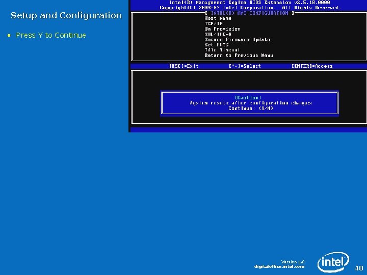 Setup and Configuration • Press Y to Continue Version 1. 0 digitaloffice. intel. com 40