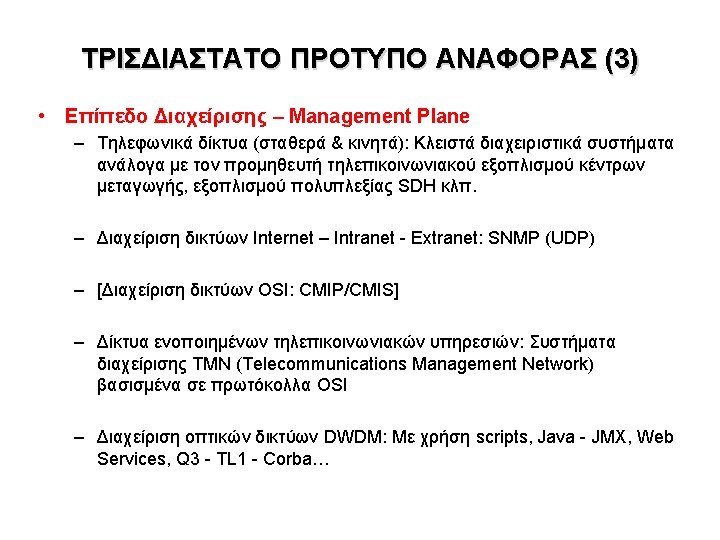 ΙΣΤΟΡΙΚΟ Εξέλιξη τηλεφωνίας – POTS (Plain Old Telephone Service), PSTN (Public Switched Telephone Network), ISDN (Integrated Services Digital Network), GSM/GPRS (κινητή τηλεφωνία 2ας γενιάς) – SPC Stored Program Control – 1960/70 – CCS Common Channel Signaling Network • SS 7 – 1970/80 – IN/1 (Intelligent Network) – 1980/1990 • Service Control Point (SCP) – εξωτερικές βάσεις δεδομένων (π. χ. για 800 -XXX…, 900 -xxxx κλπ. ) • ITU: IN CS-1 (Capability Set 1) • Bellcore (USA): AIN (Advanced Intelligent Network) – 3 G, UMTS κινητή τηλεφωνία 3ης γενίας – Vo. IP (Voice over IP), ITU (TELCO) or SIP (Internet – IETF) signaling