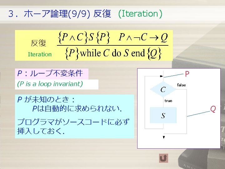 3.ホーア論理 (8/9) 選択 (Selection) 選択 Selection Pが未知のとき: P = (C→ P 1)∧(¬C → P 2) ただし, {P 1} S 1 {Q}, {P 2} S 2 {Q} を満たすP 1とP 2を再帰的に求める. If P is unknown, let P = (C→ P 1)∧(¬C → P 2) , where we recursively obtain P 1 and P 2 such that {P 1} S 1 {Q}, {P 2} S 2 {Q}. true P 1 S 1 C P false P 2 S 2 Q