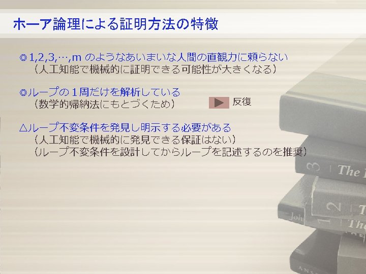 例題2 mとnの積 (2/3) ループ継続 Loop repetition invariant 反復