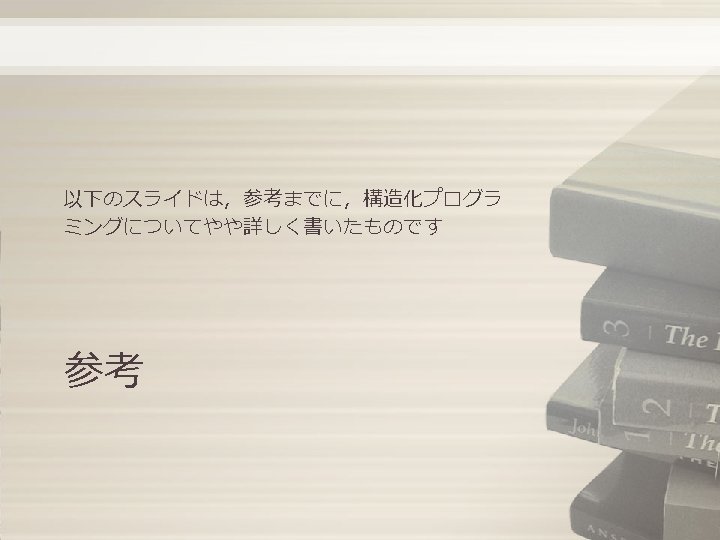 1 構造化プログラミング(2/2) 順次 (sequence) 選択 (selection) S 1 C S 2 S 1; S 2 反復 (iteration) F T S 1 S 2 if C then S 1 else S 2 • 出入口はそれぞれ1カ所 F C T S while C do S (Only one entrance and one exit) • 流れを表す線が交差しない (No crossings of flow lines)