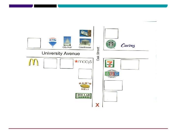 City Hall Courthouse University Avenue Oak Street A: ask where • Re. Max • Ace Hardware • Firehouse • Sam’s Deli B: give location 1. from corner 2. from place X