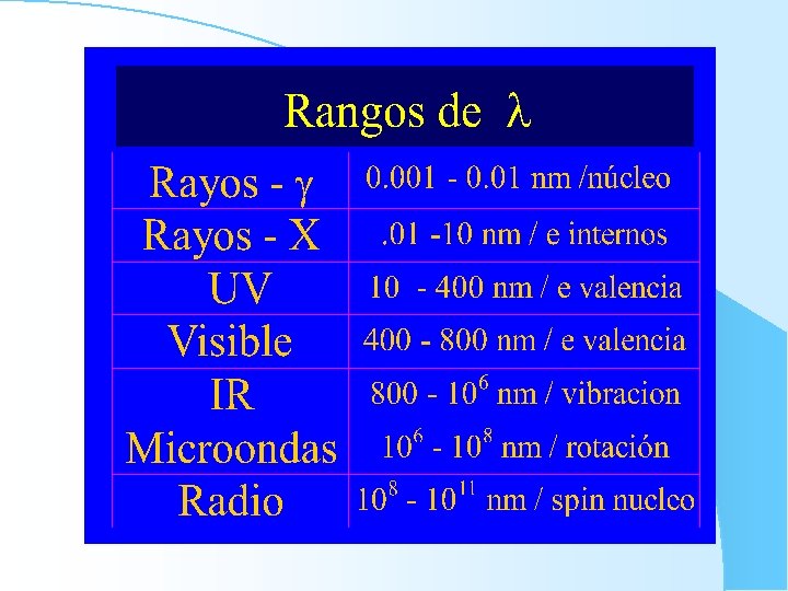 Rayos X Se producen por una corriente de e- emitida de un cátodo acelerado por una diferencia de potencial elevado hacia el ánodo. Utilizan en medicina, radioterapìa, fotocopiado (radiografías, destrucción de tejidos cancerosos) Q. Analítica: Determinación de metales y no metales Ondas de Radio Ondas cortas, con frecuencia de 300 GHz. Ondas largas, con frecuencia mínimas de 30 KHz Se utilizan en las comunicaciones