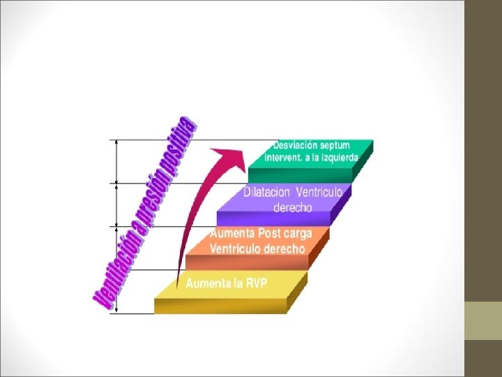 EFECTOS SOBRE LA CIRCULACIÓN DEL PULMÓN DAÑADO • Efecto directo sobre Ventrículo Derecho. • Aumento de RVPulmonares Aumento de trabajo de VD. • VM: Disfunción VD parámetros VM (protección pulmonar). • Afectación VD Afectación VI. • Dilatación VD Aumento presiones diastólicas VI (presiones microvasculares, edema)