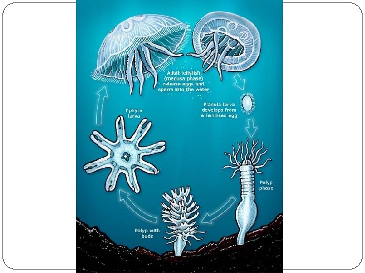 2. Cnidarians reproduce both sexually and asexually. a. Polyp forms reproduce asexually by budding b. Some polyps also reproduce sexually by releasing sperm or eggs c. Medusa forms have a two stage life cycle in which they reproduce both sexually and