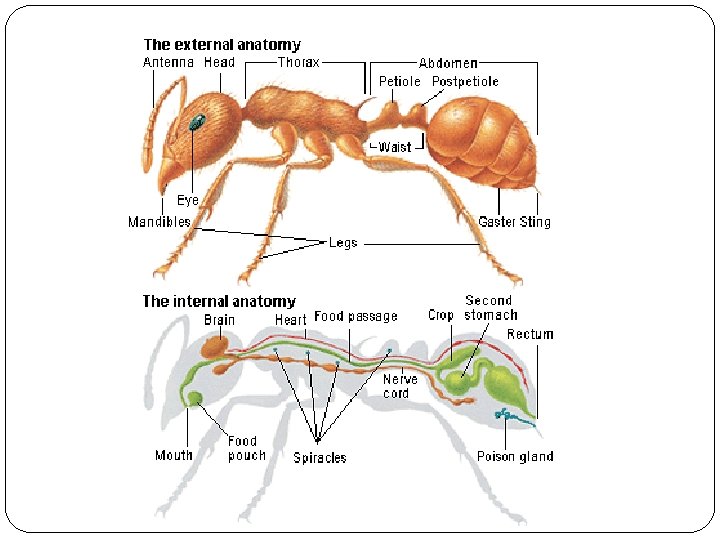 A. Arthropods – have appendages such as claws, legs, and antennae plus an exoskeleton 1. Insects- such as ants have three body regions called the head, the thorax, and the abdomen a. Open circulatory system transports food and waste but spiracles gather oxygen