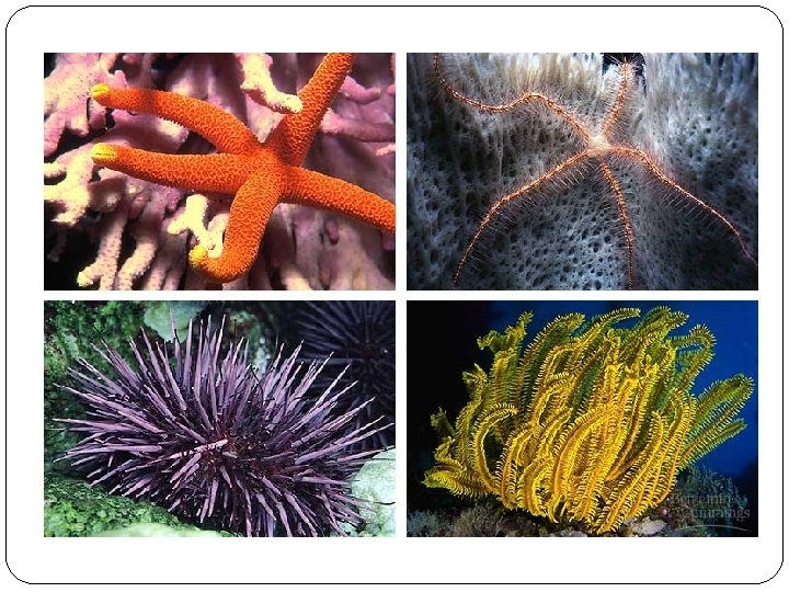 B. Echinoderms- have radial symmetry 1. Diets vary- some are predators, some filter feed, some eat rotting material. 2. Echinoderms have spiny skin covering an internal skeleton of plates 3. Echinoderms have a water-vascular system to help them move and eat. 4. Some echinoderms can reproduce through regeneration