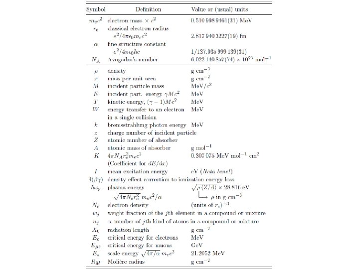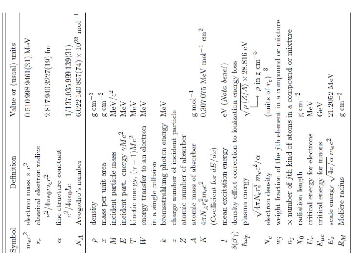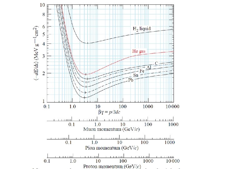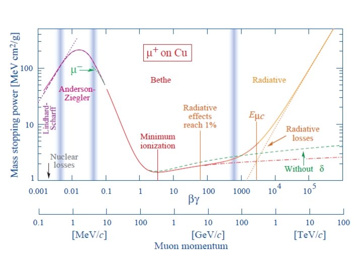 Bethe-Bloch formula Discussion: • Function of β only independent of M! -> d. E/dx used for particle identification. P can be measured in B-field -> v from d. E/dx -> M calculated • Valid for βc larger than that of orbital electrons (~Zαc), small enough that radiative effects do not dominate. • Dependence on material small ~Z/A , except for hydrogen • I Mean excitation energy, trickiest part! For elements heavier than oxygen. Minimum ionization at In typical high energy physics experiments, most particles are minimum ionizing (MIP) or above. Relativistic rise from extension of transverse range counteracted by, Density effect limitation of transverse range through polarization of medium large correction for high density 50%-70% relativistic rise for noble gases much less for liquids and solids.
